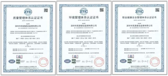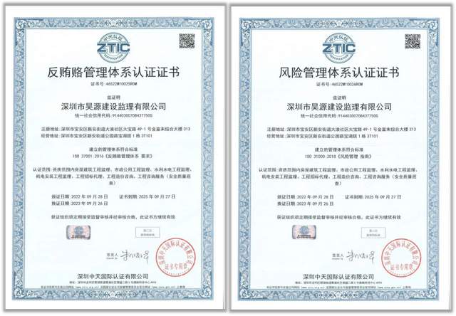 昊源监理继质量管理、职业健康、环境管理、风险管理与反贿赂外,新增了第6项ISO认证证书-企业诚信管理体系证书。目前,公司除了ISO管理体系认证,还拥有3A企业信用等级、国家高新技术企业等证书,为分公司与合伙人承揽项目提供了强大的后盾。